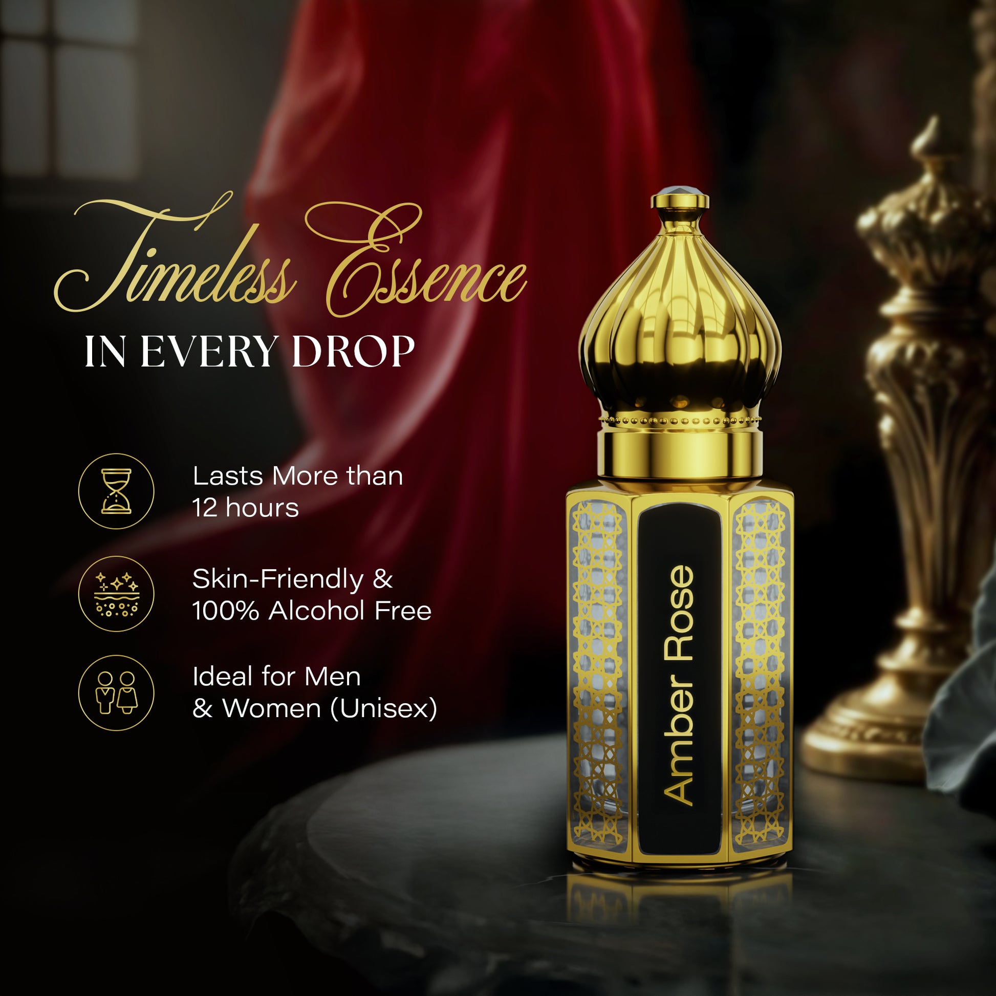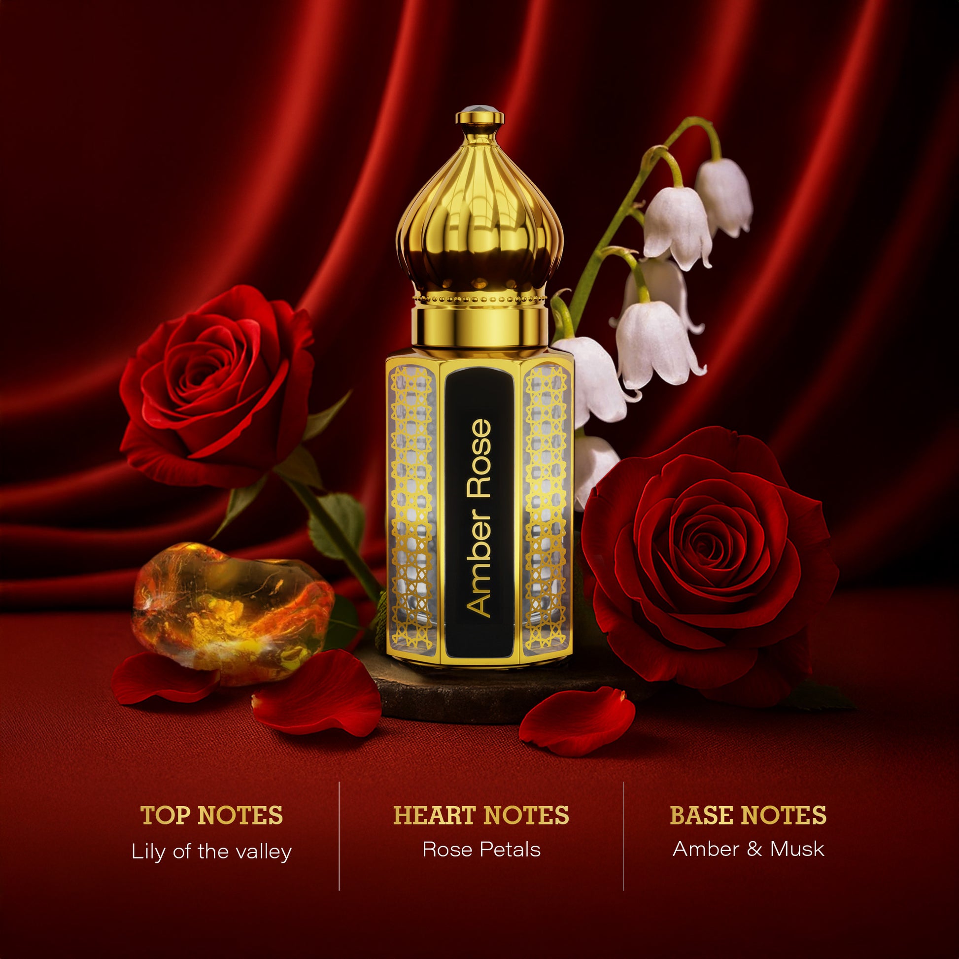 At its heart, the fragrance blooms into a romantic bouquet of velvety rose petals, capturing timeless beauty and elegance. As it settles, the warm golden glow of amber blends with the sensual depth of musk, leaving a soft yet captivating trail on the skin.