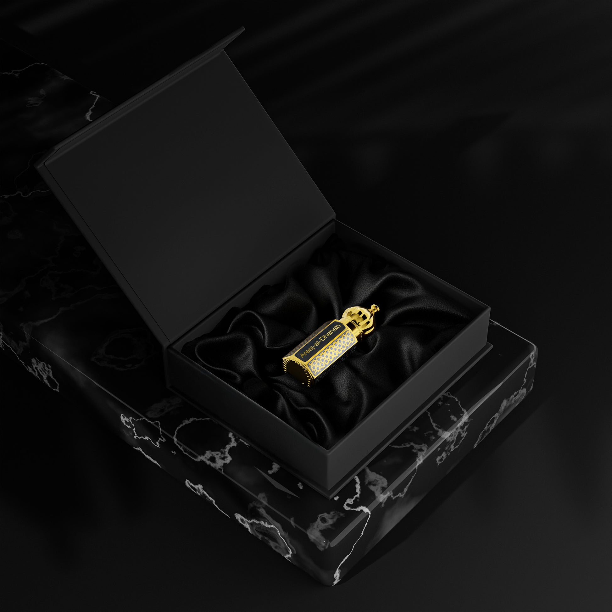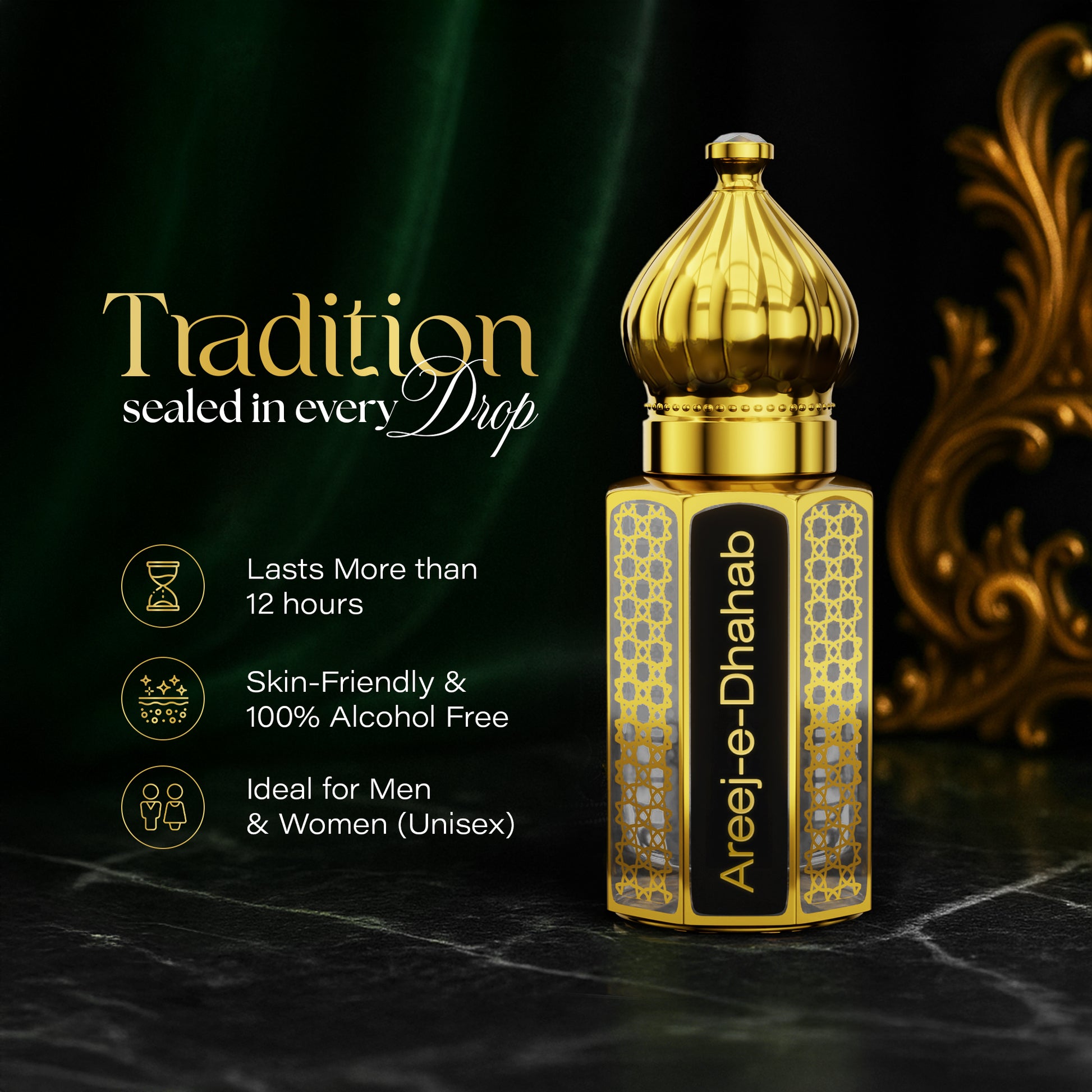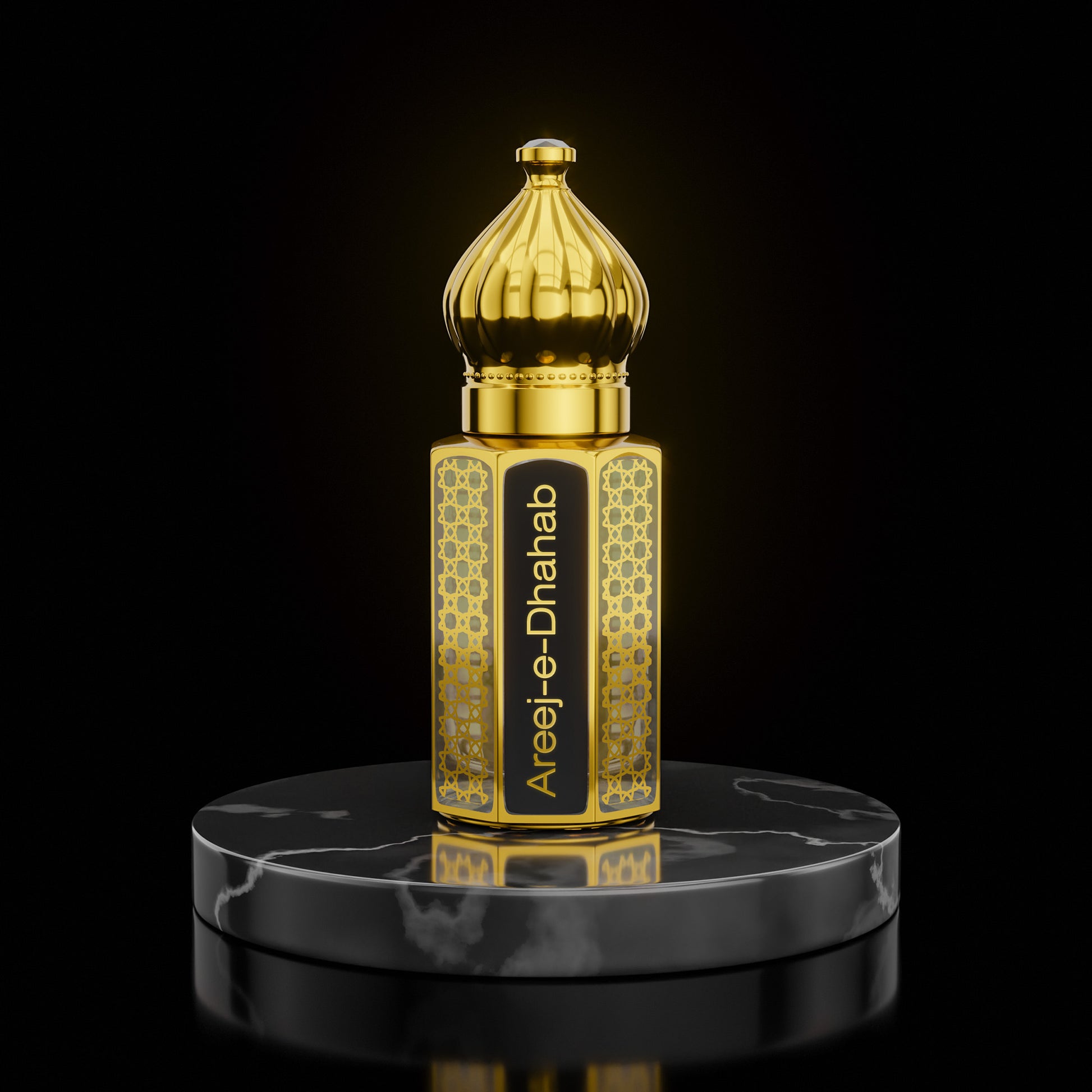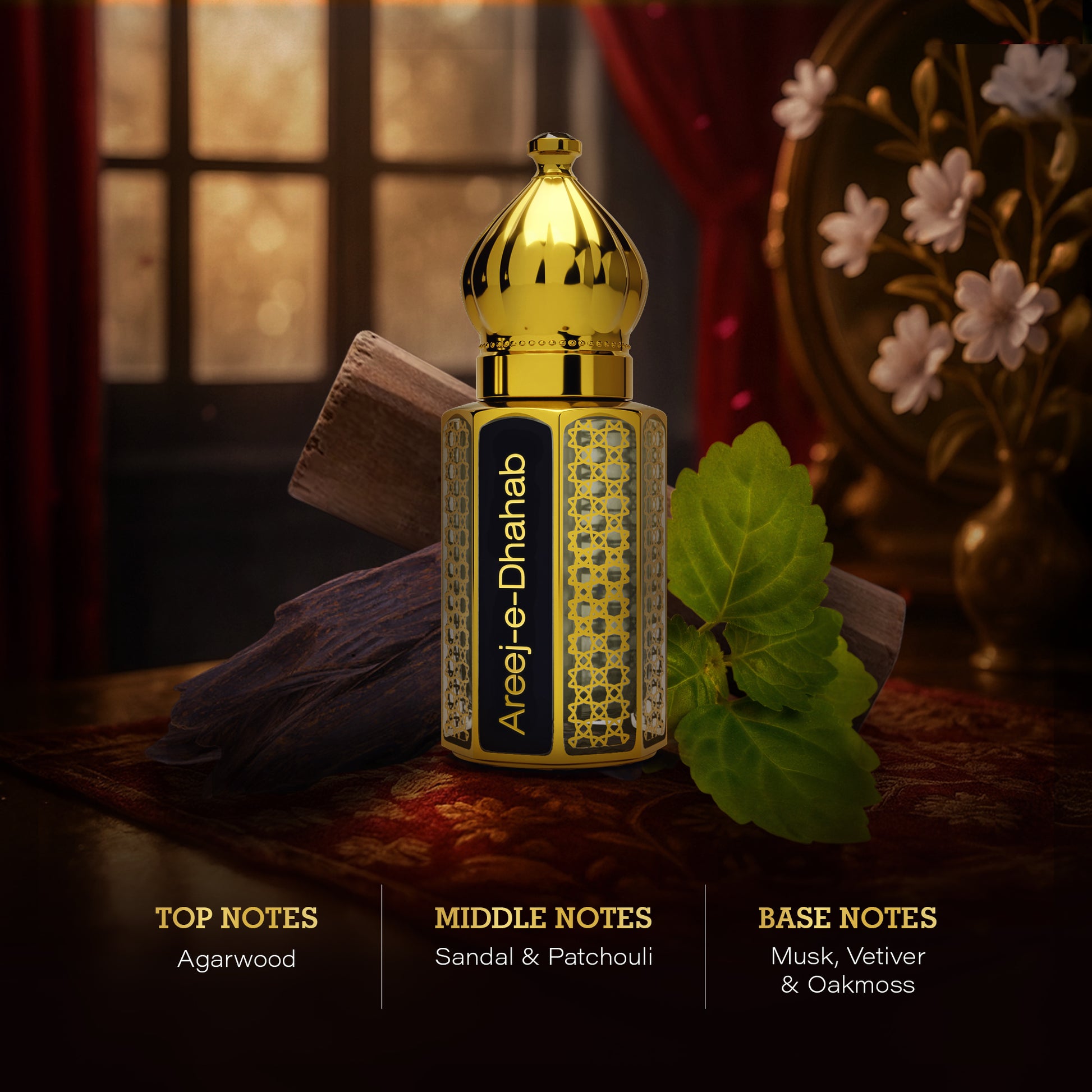 Areej-e-Dhahab unfolds with the deep, resinous richness of agarwood (oud), immediately evoking a sense of mystery and grandeur. At the heart, the fragrance softens into the creamy warmth of sandalwood blended with the earthy elegance of patchouli, creating a balanced harmony between depth and refinement.