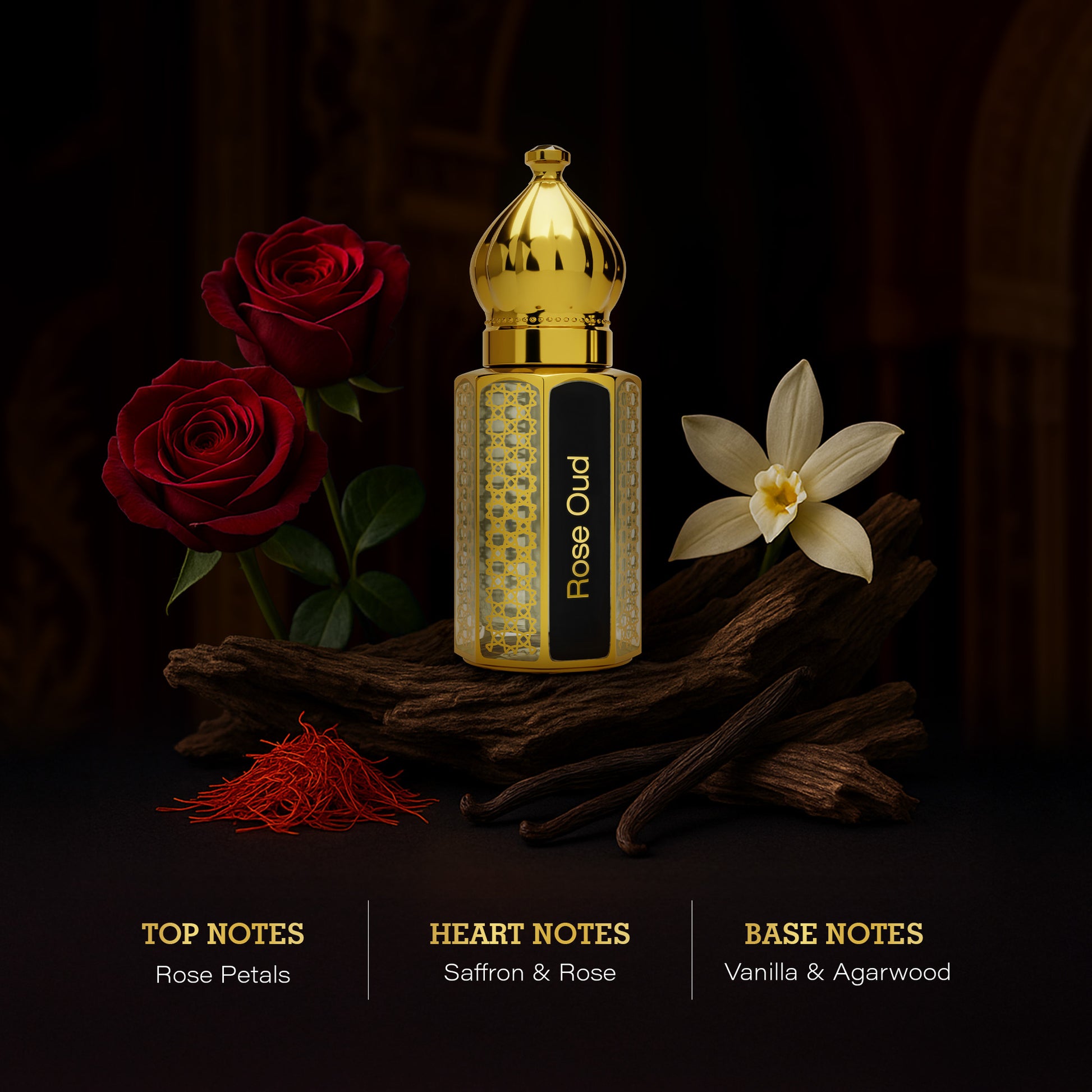 Rose Oud is a rich and sensual fragrance that opens with the delicate softness of fresh rose petals, immediately setting a romantic and elegant tone. At its heart, the fragrance deepens with velvety rose enriched by the warm, spicy glow of saffron, adding depth and sophistication.