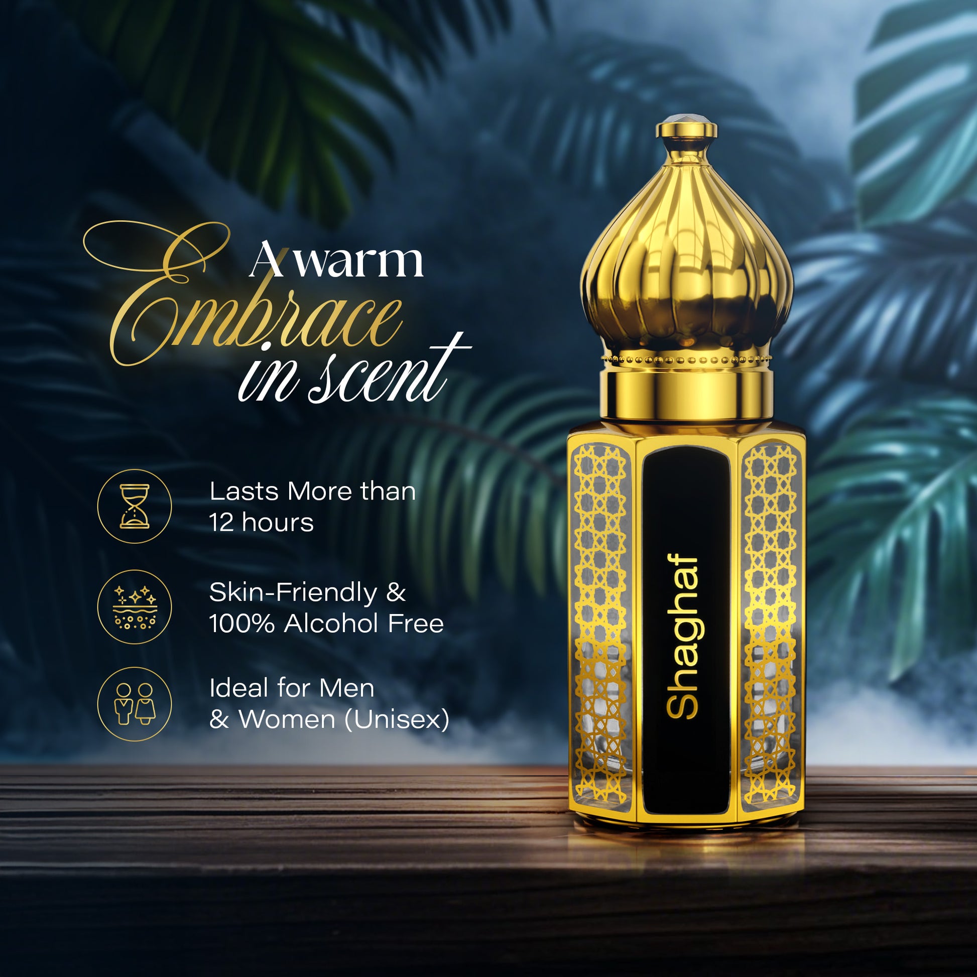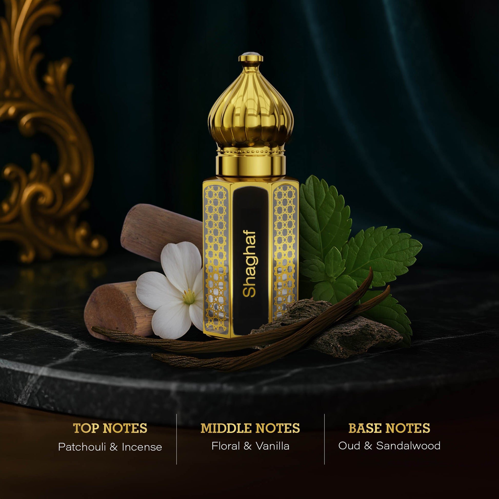Shaghaf ignites with the smoky depth of incense wrapped in the earthy richness of patchouli, setting a mysterious and captivating tone. At its heart, a delicate floral accord softens into the creamy sweetness of vanilla, adding both elegance and warmth.