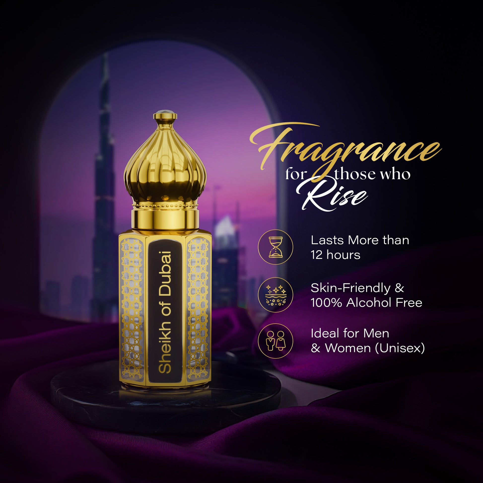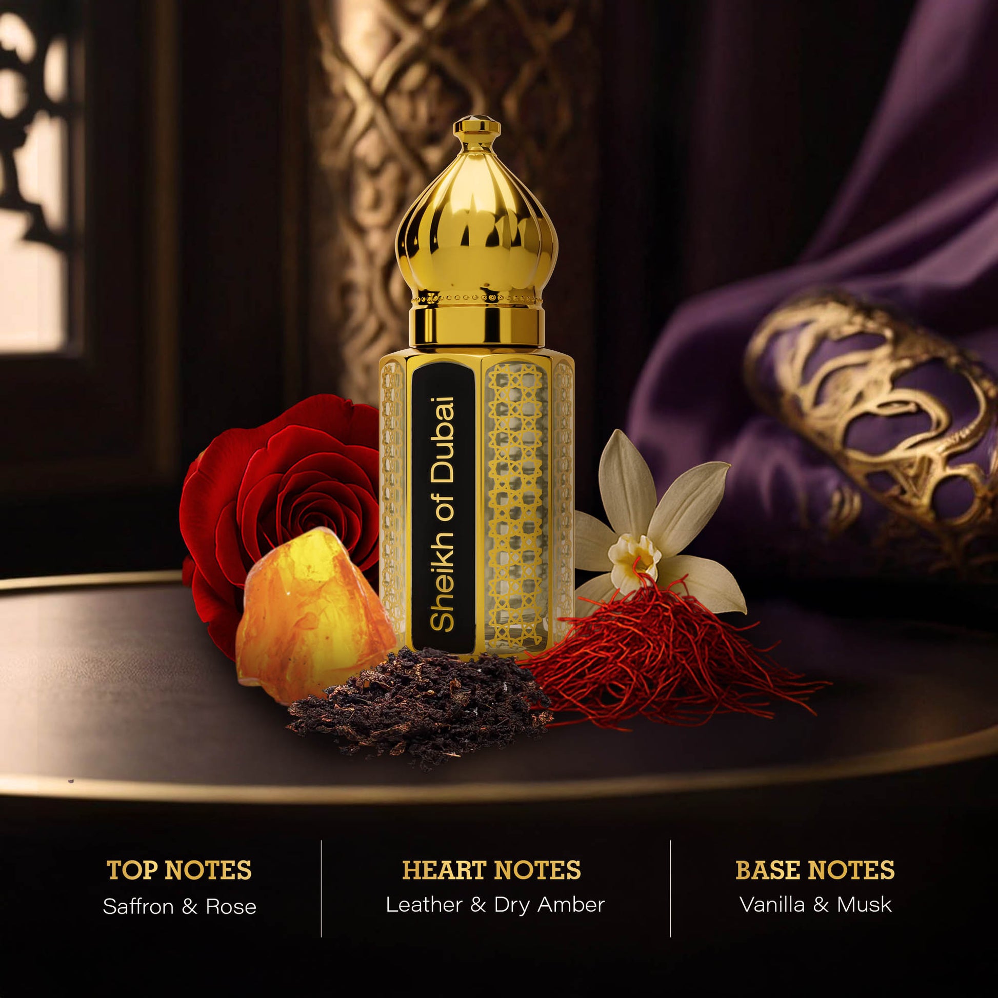 Sheikh of Dubai opens with the luxurious warmth of saffron wrapped in the timeless elegance of rose, a royal introduction that exudes wealth and sophistication.
